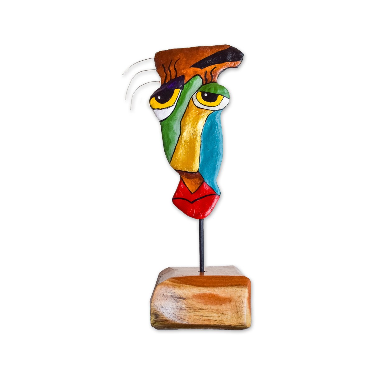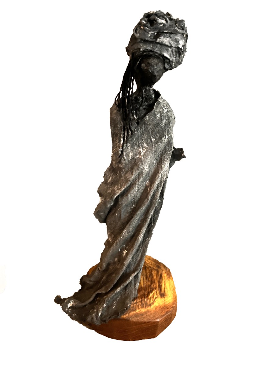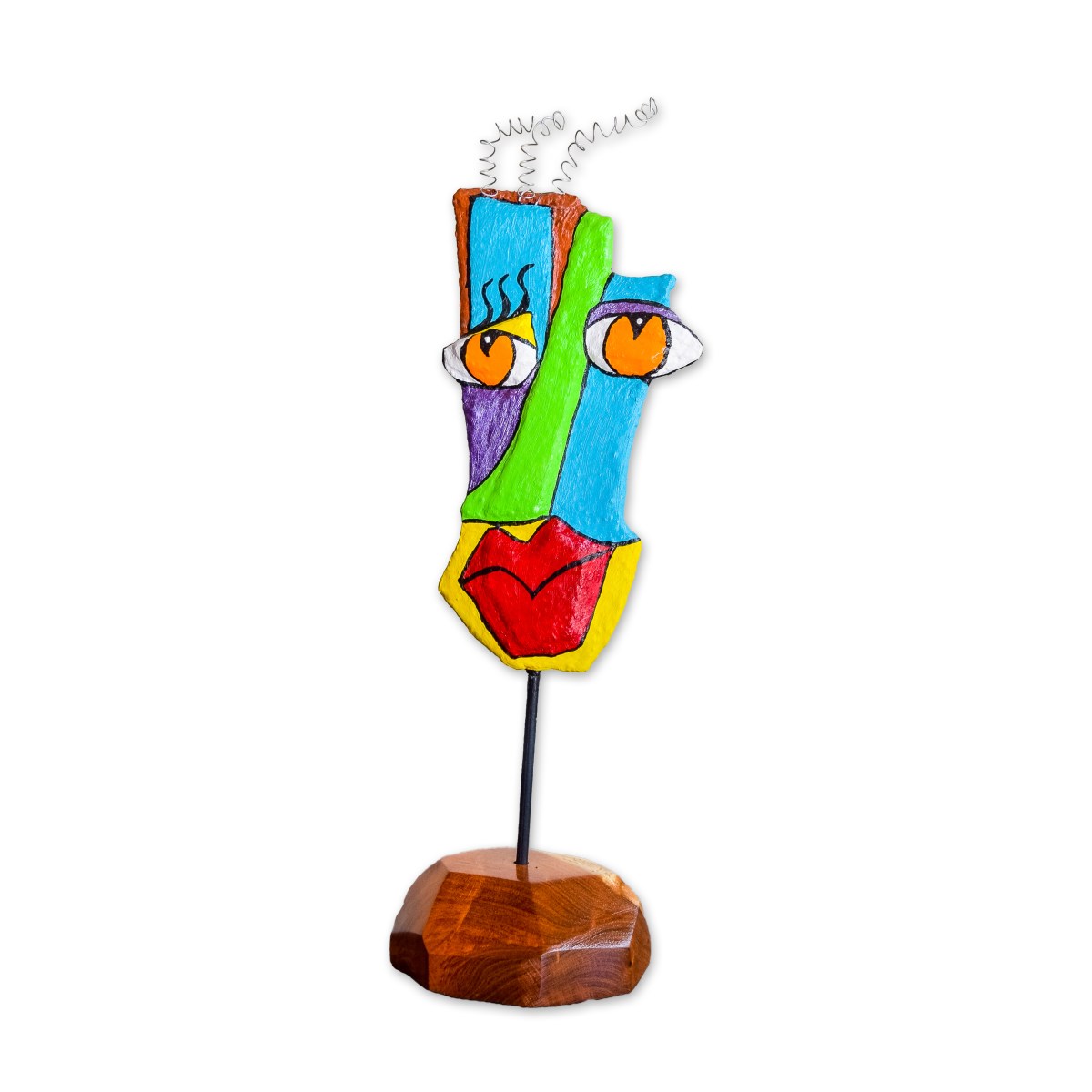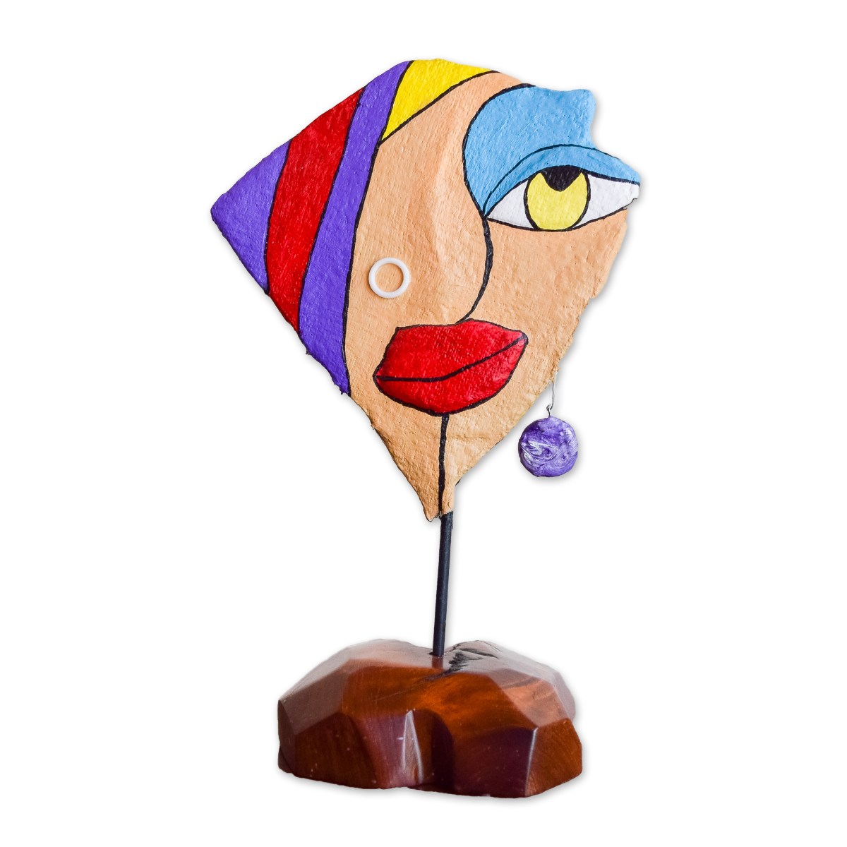 My sculptures are made of “stovetop porcelain” clay with acrylic paint and adornments of wire, plastic, fabric or glass. These fun, whimsical conversation pieces are inspired by the real-life and fictional characters I see every day. Each sculpture comes with its own unique solid wood display stand. If you would like more photos before purchasing, please ask.