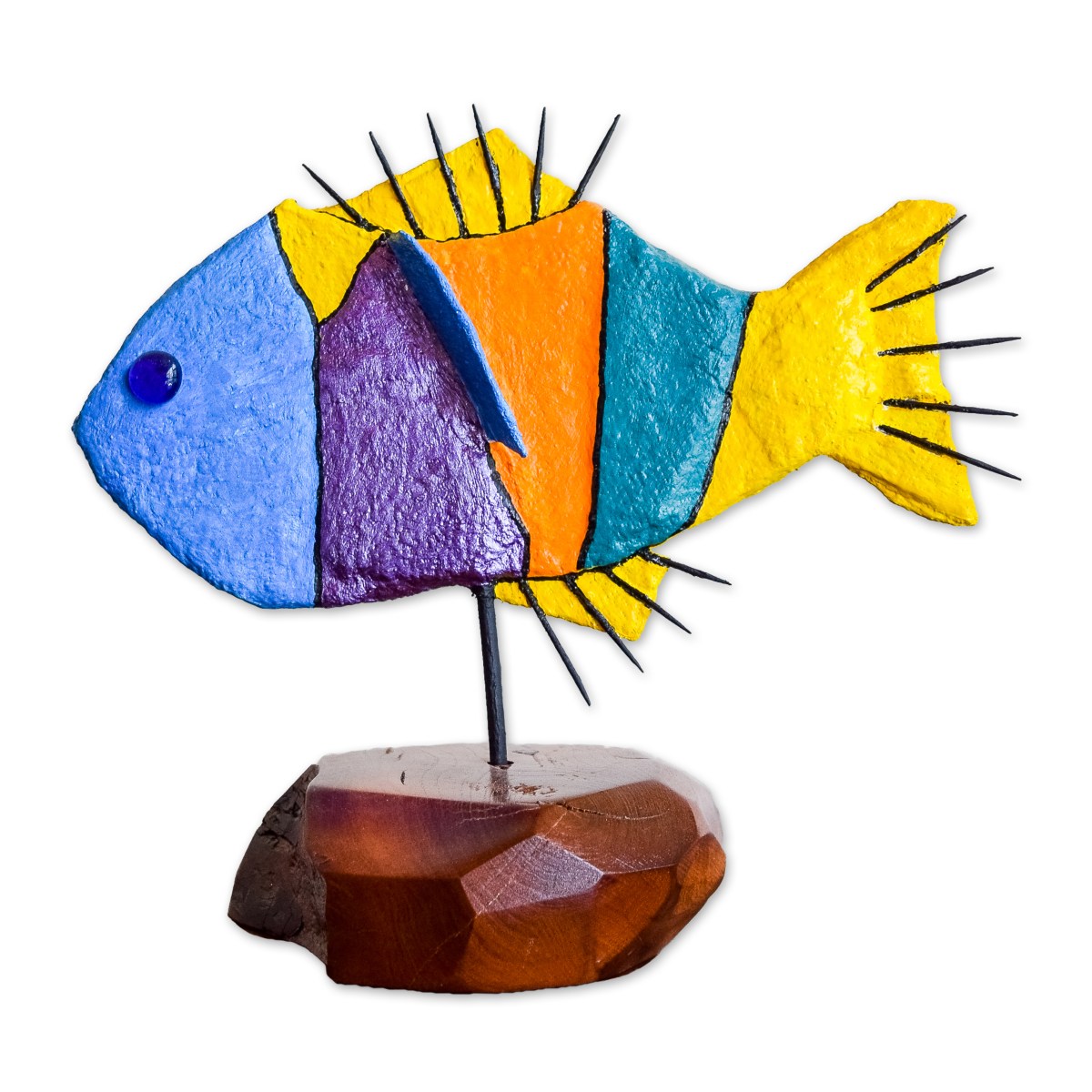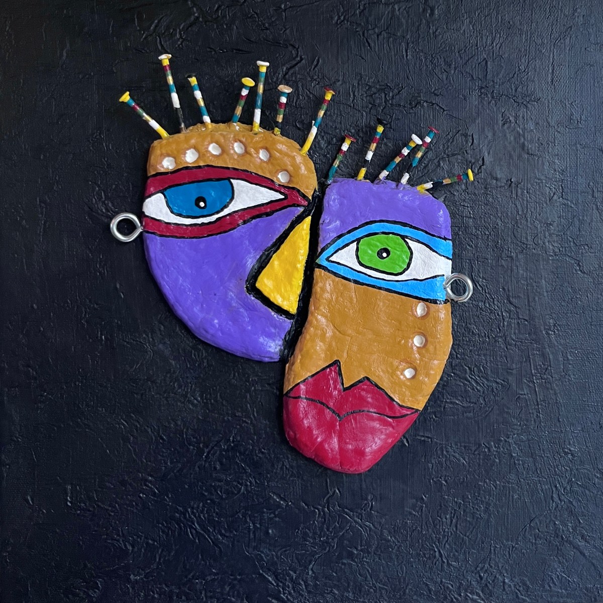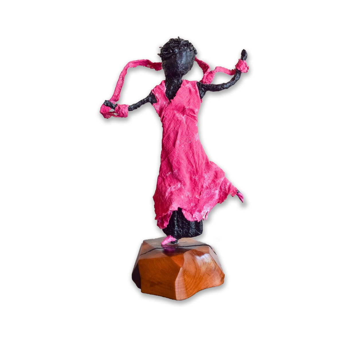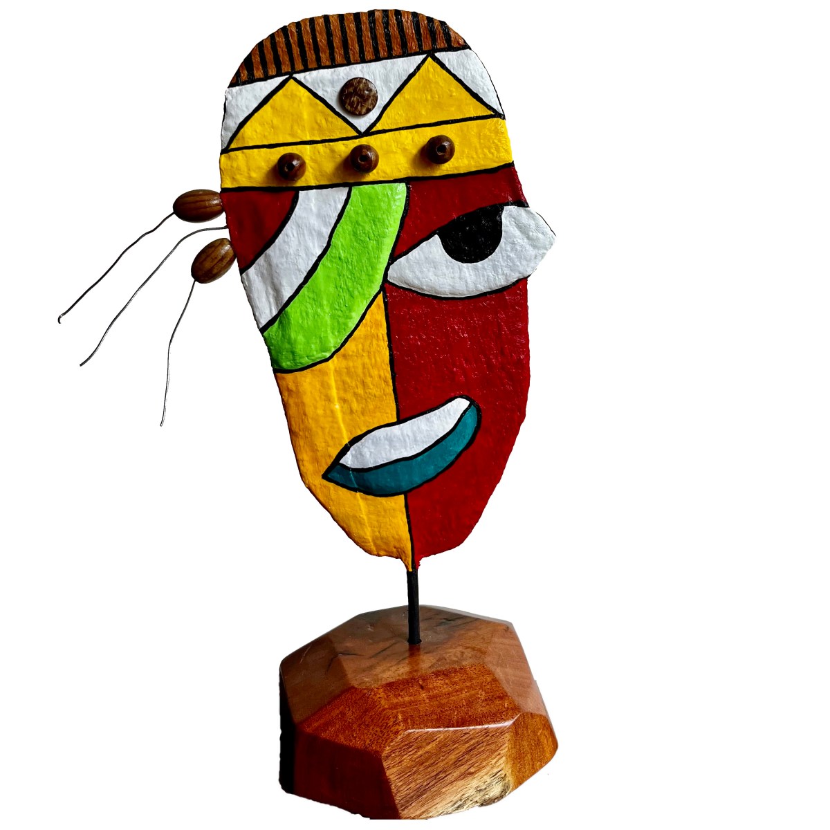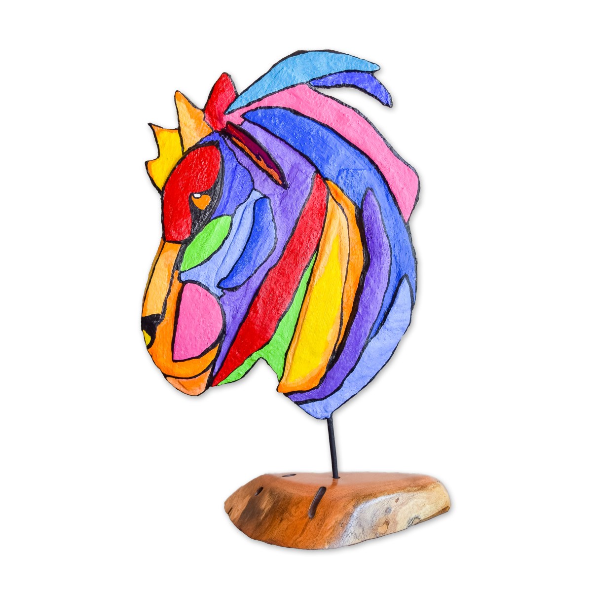 My sculptures are made of “stovetop porcelain” clay with acrylic paint and adornments of wire, plastic, fabric or glass. These fun, whimsical conversation pieces are inspired by the real-life and fictional characters I see every day. Each sculpture comes with its own unique solid wood display stand. If you would like more photos before purchasing, please ask.
