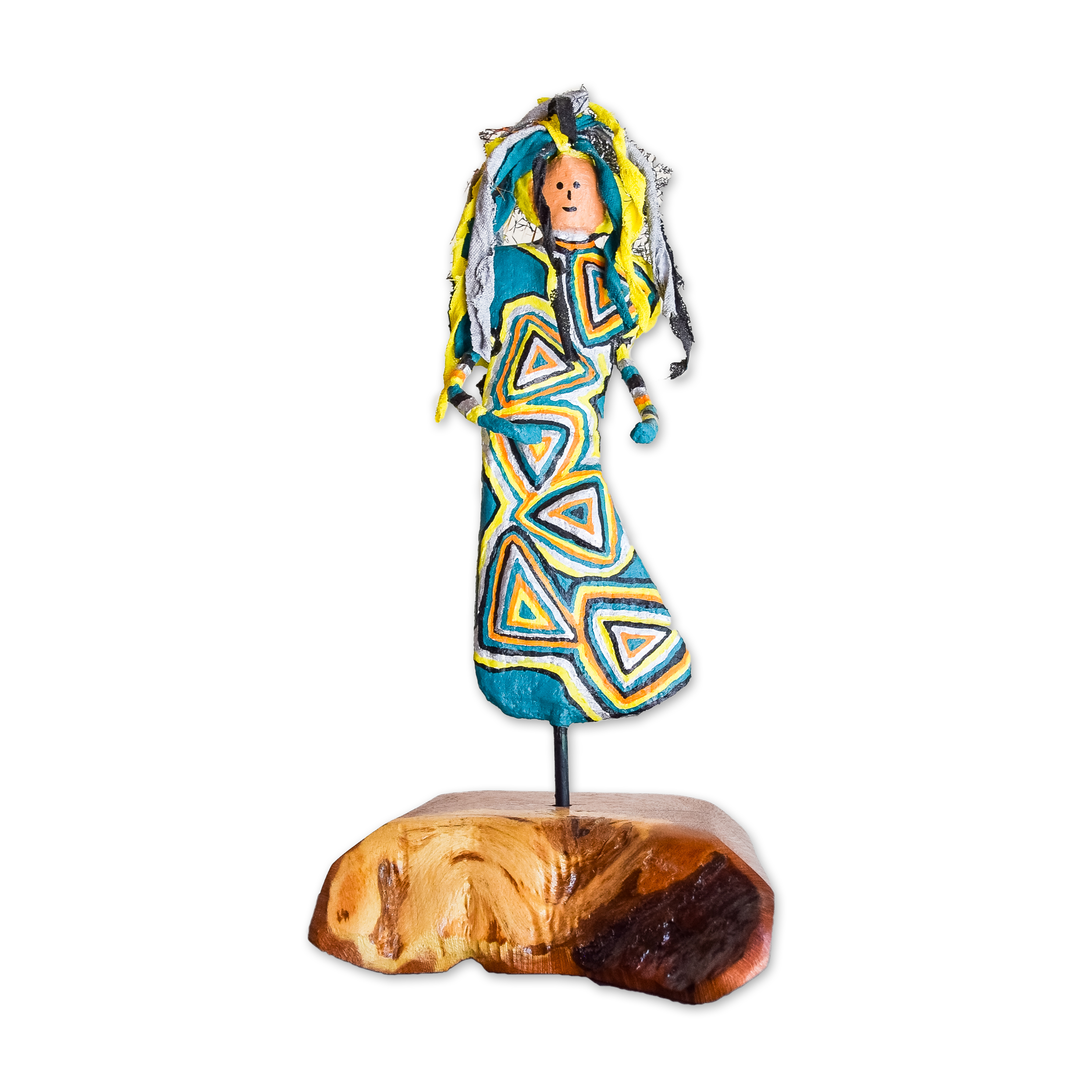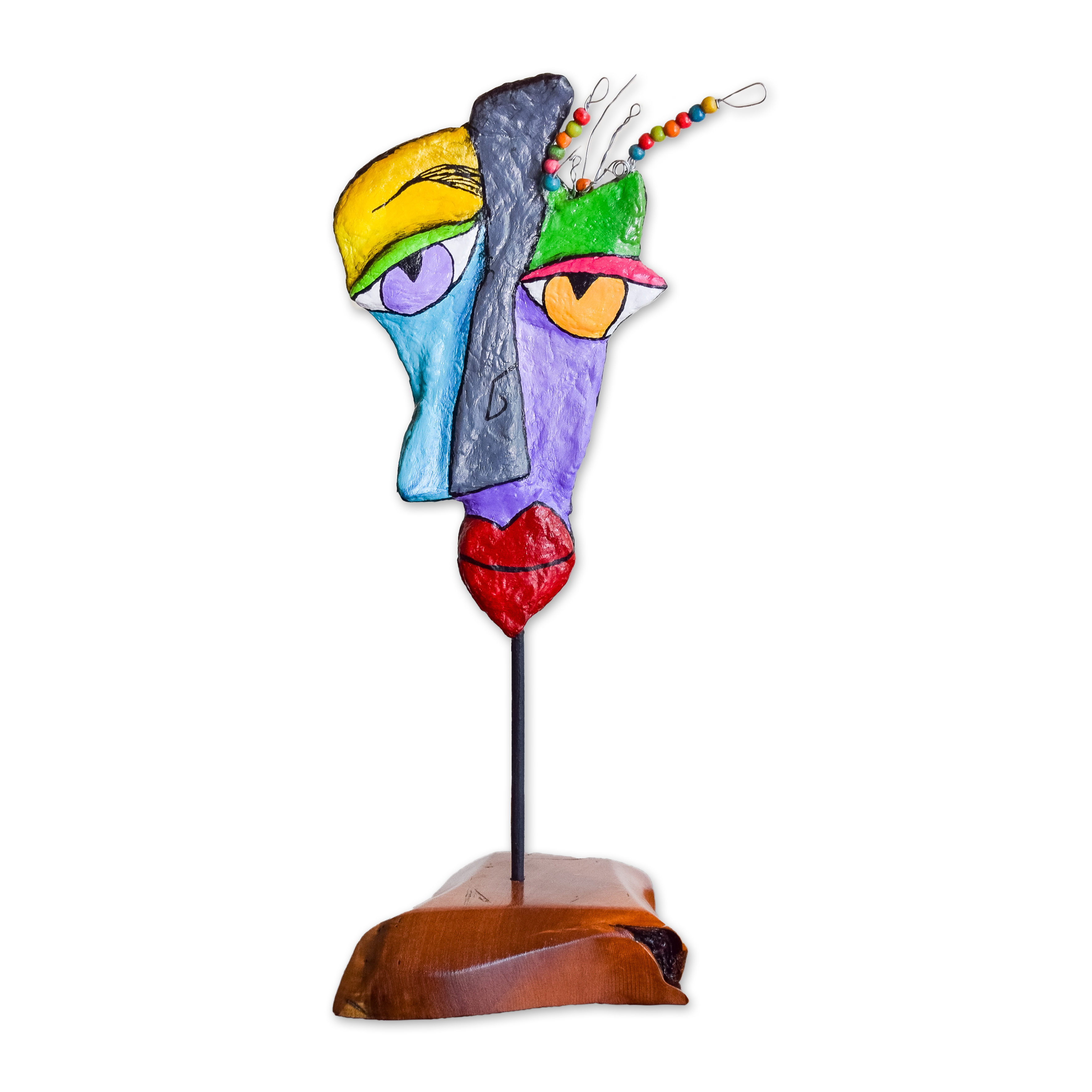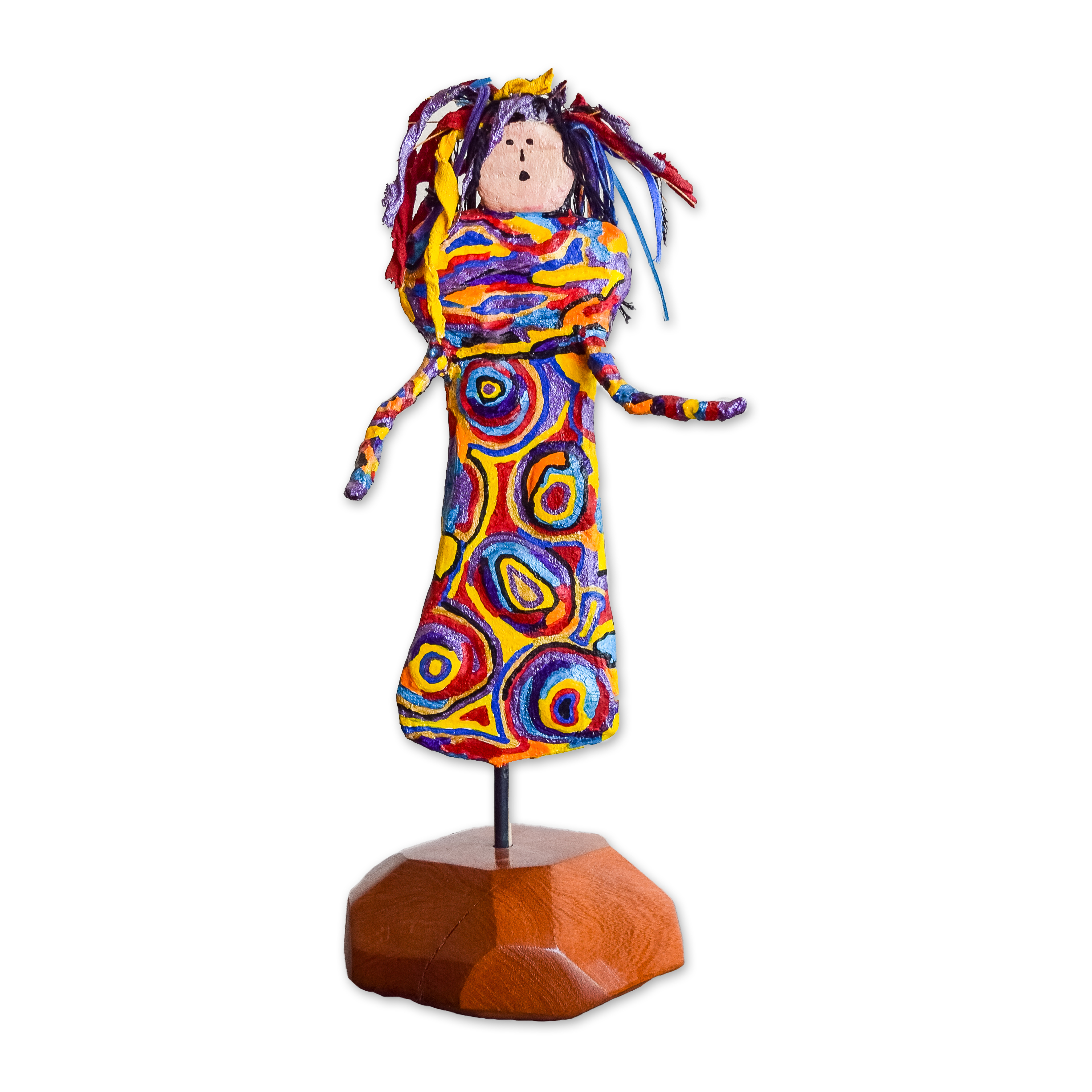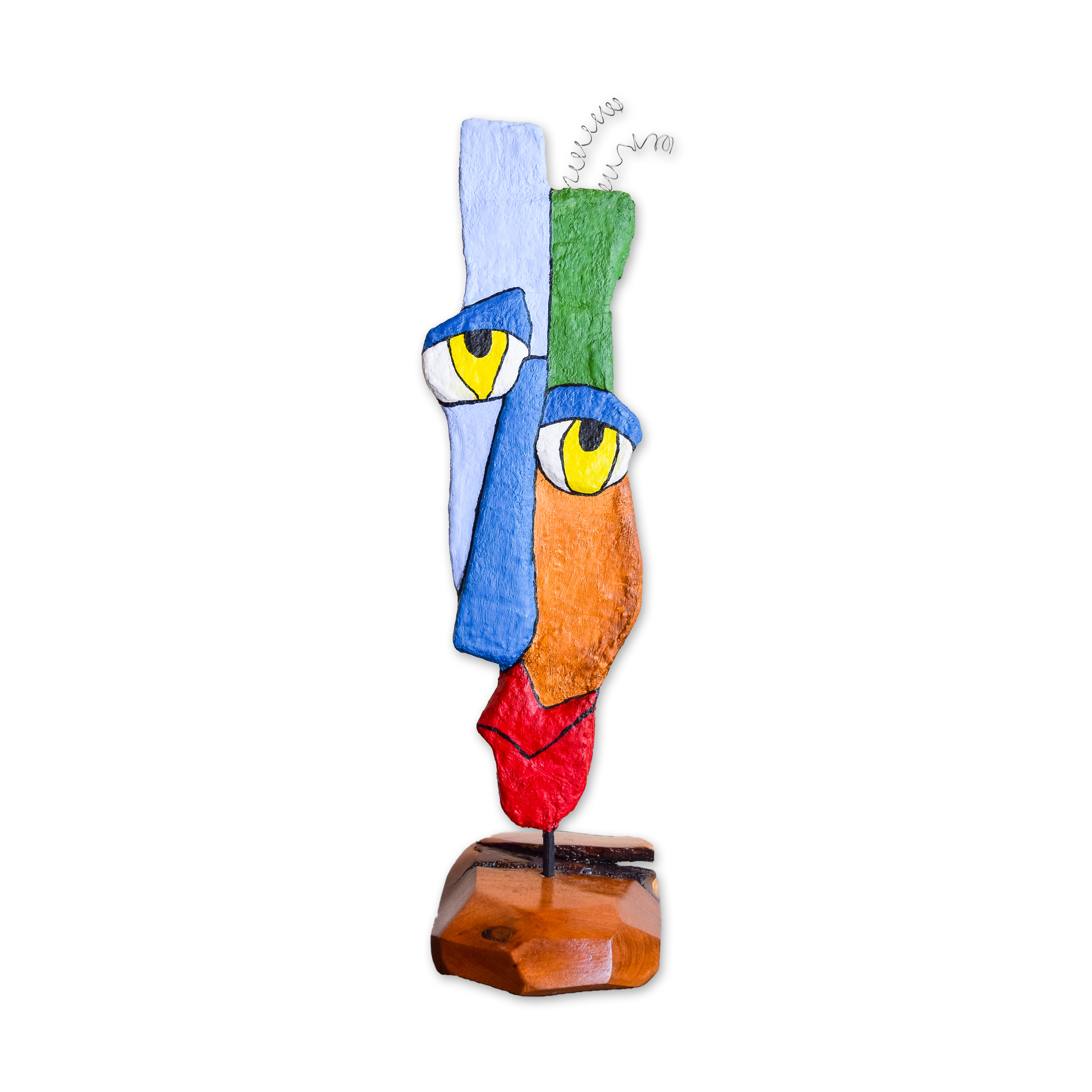 My sculptures are made of “stovetop porcelain” clay with acrylic paint and adornments of wire, plastic, fabric or glass. These fun, whimsical conversation pieces are inspired by the real-life and fictional characters I see every day. Each sculpture comes with its own unique solid wood display stand. If you would like more photos before purchasing, please ask.