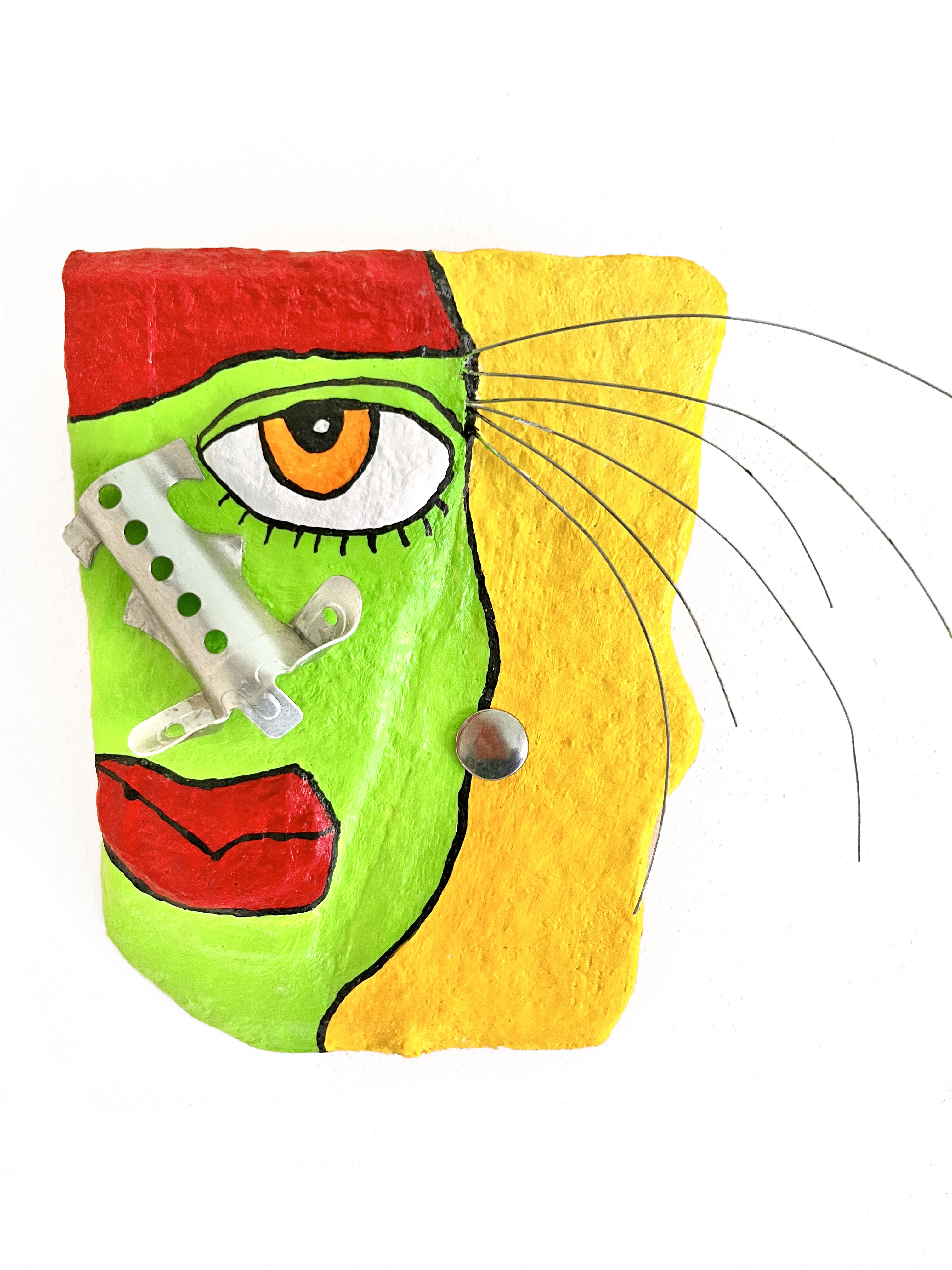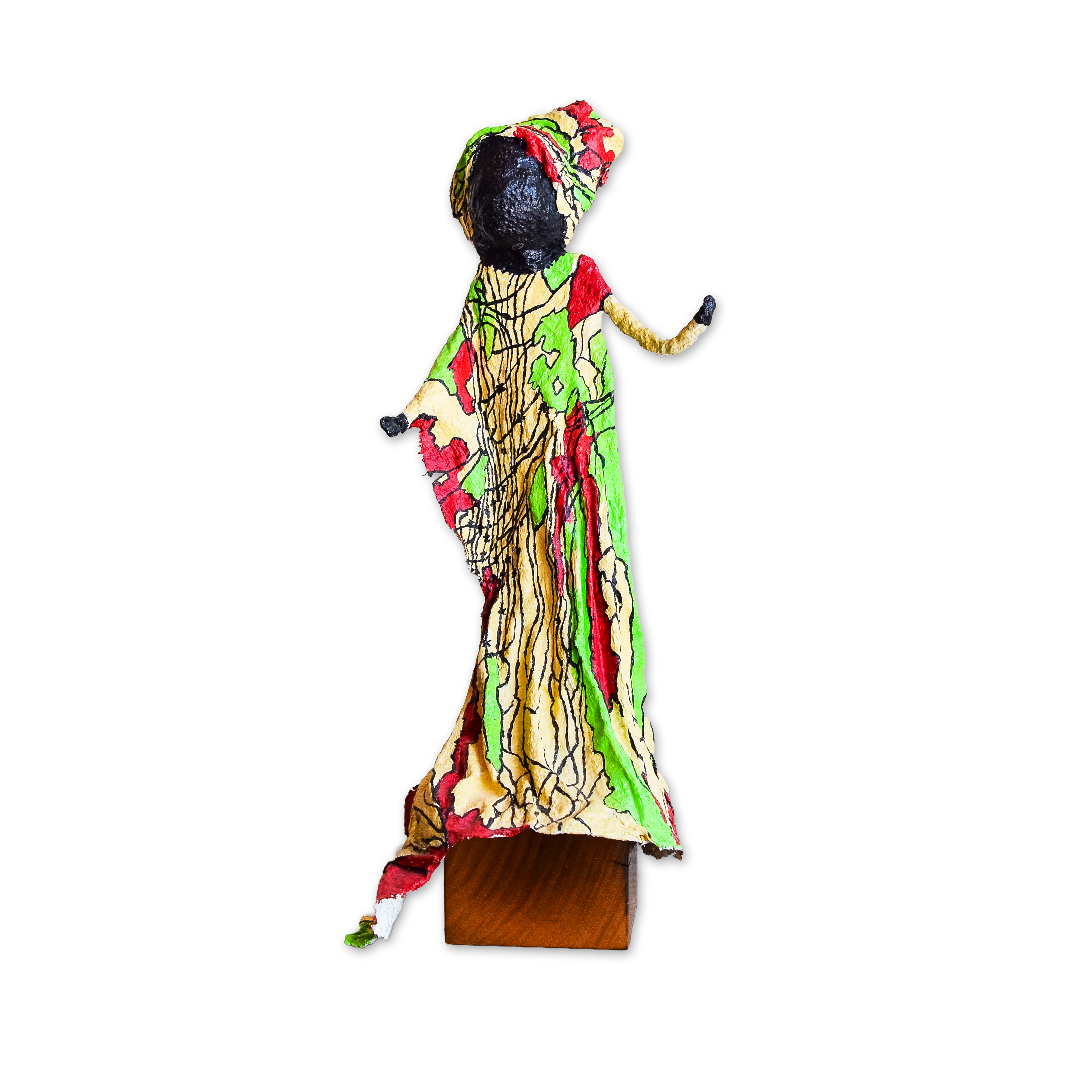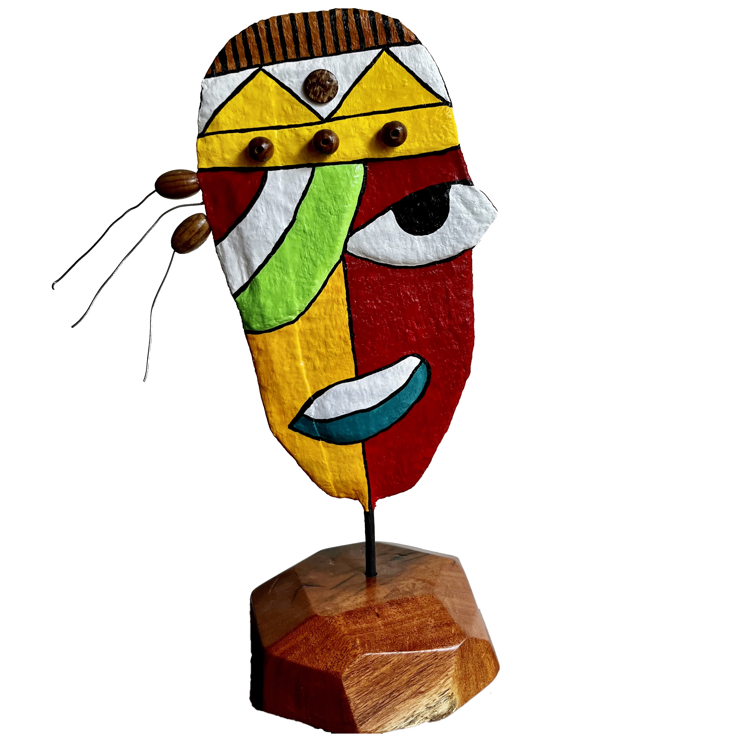 My sculptures are made of “stovetop porcelain” clay with acrylic paint and adornments of wire, plastic, fabric or glass. These fun, whimsical conversation pieces are inspired by the real-life and fictional characters I see every day. Each sculpture comes with its own unique solid wood display stand. If you would like more photos before purchasing, please ask.